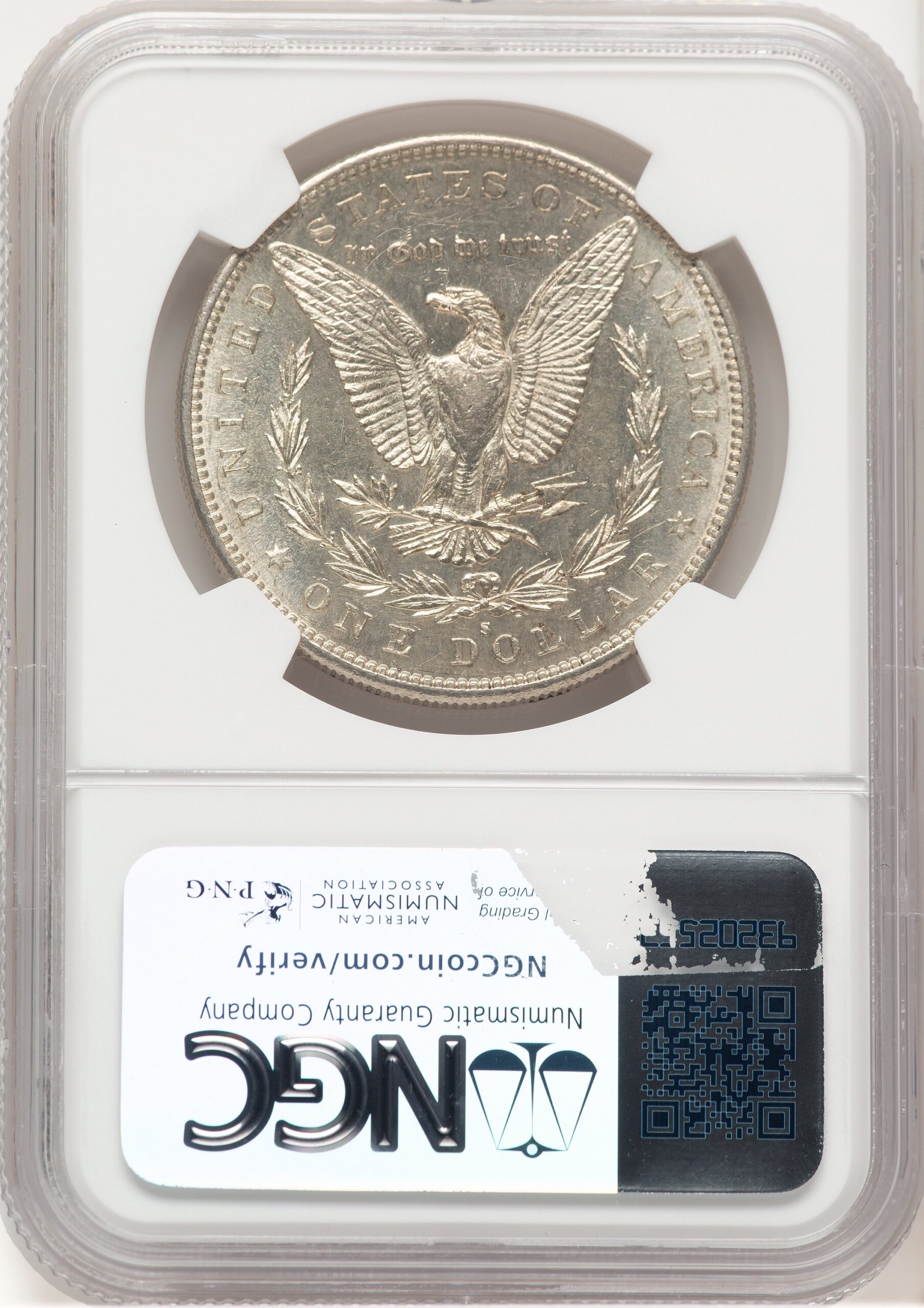 This 1884-S Morgan Dollar has been certified and graded by NGC as AU58. The Morgan Silver Dollar is named after its designer George T. Morgan and was minted from 1878 to 1904 and again 1921. These iconic silver coins continue to be one of the most popular coins to collect in the United States.