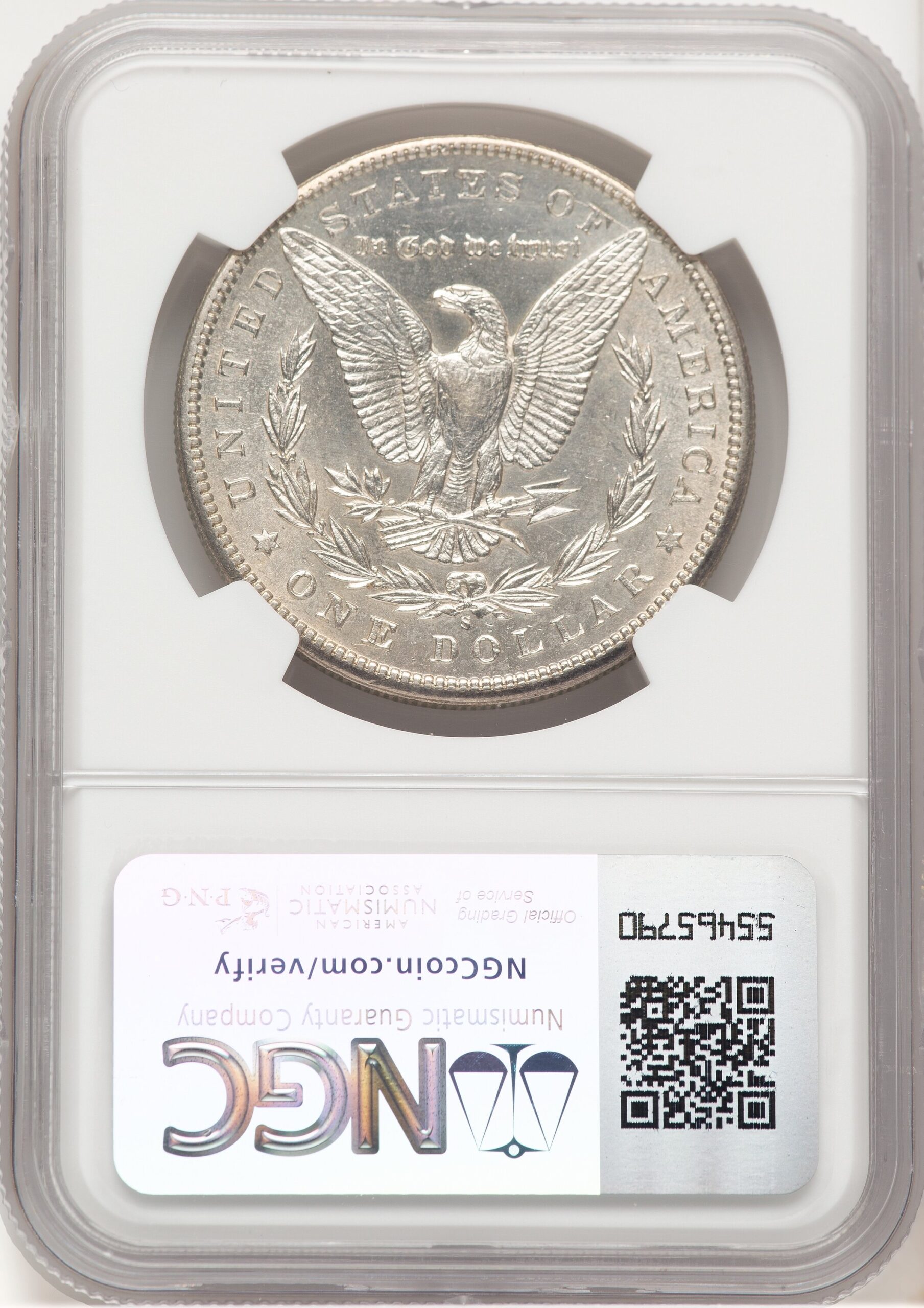 This 1899-S Morgan Dollar has been certified and graded by NGC as AU58. The Morgan Silver Dollar is named after its designer George T. Morgan and was minted from 1878 to 1904 and again 1921. These iconic silver coins continue to be one of the most popular coins to collect in the United States.