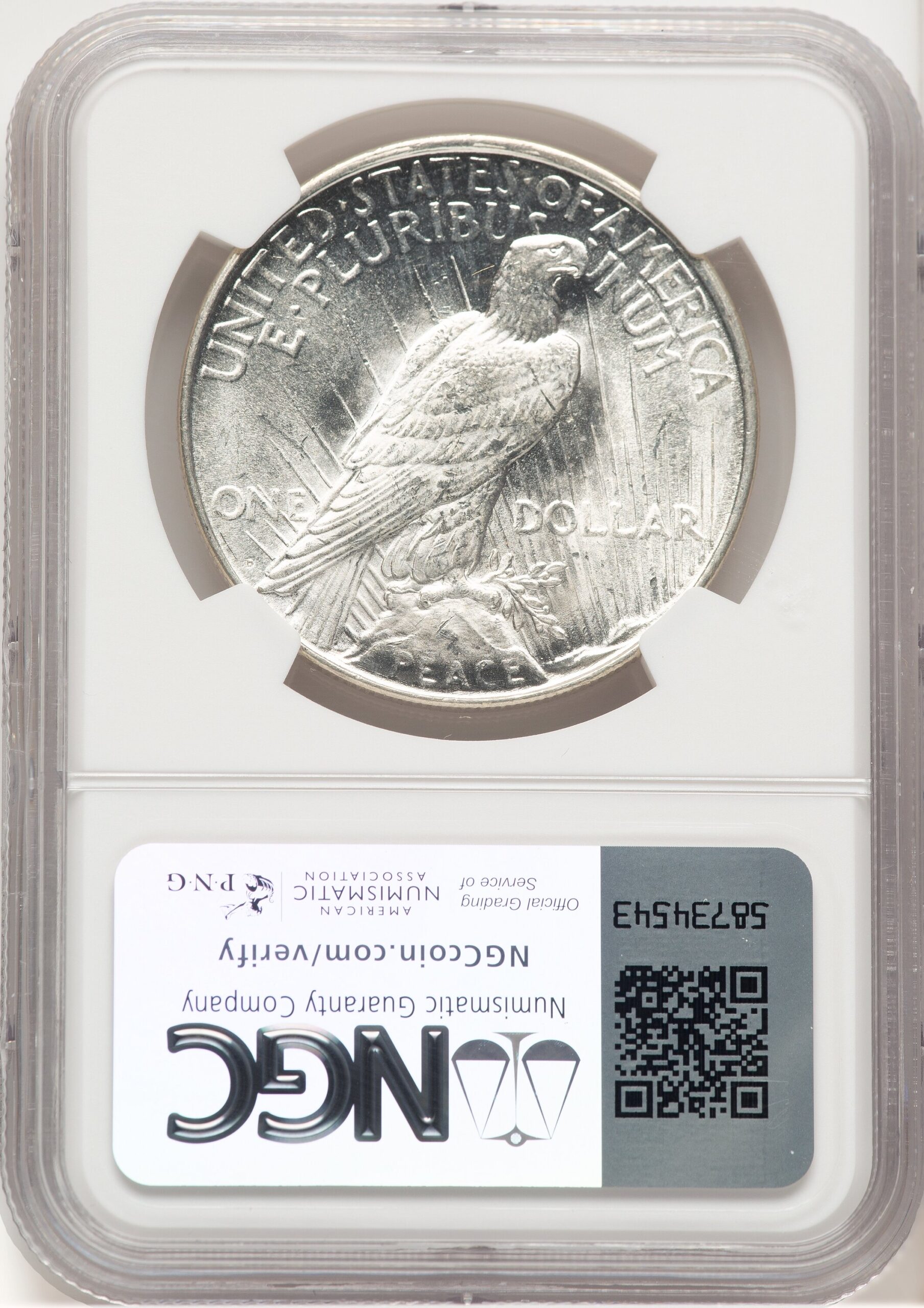 This 1922-D Peace Dollar has been certified and graded by NGC as MS66 . NGC’s encapsulation guarantees the coins MS66 Condition.